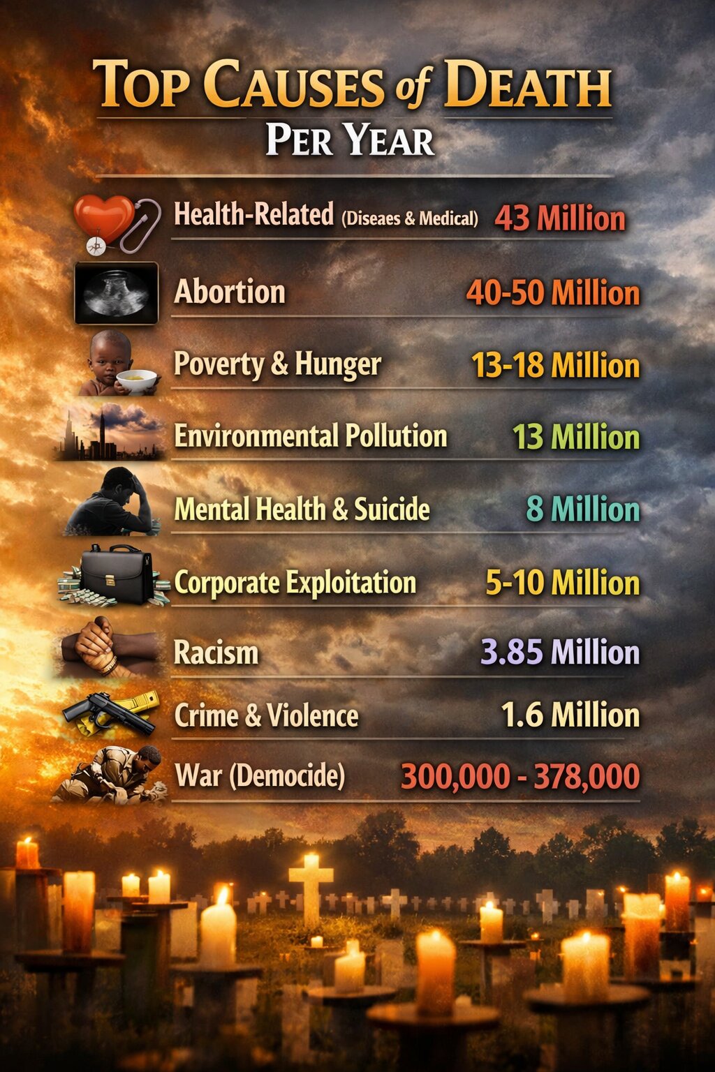 - Disease/Bad health: ~43,000,000 people/year (2021)3 (most due to poverty/bad habits/junk food and a lot due to poverty)